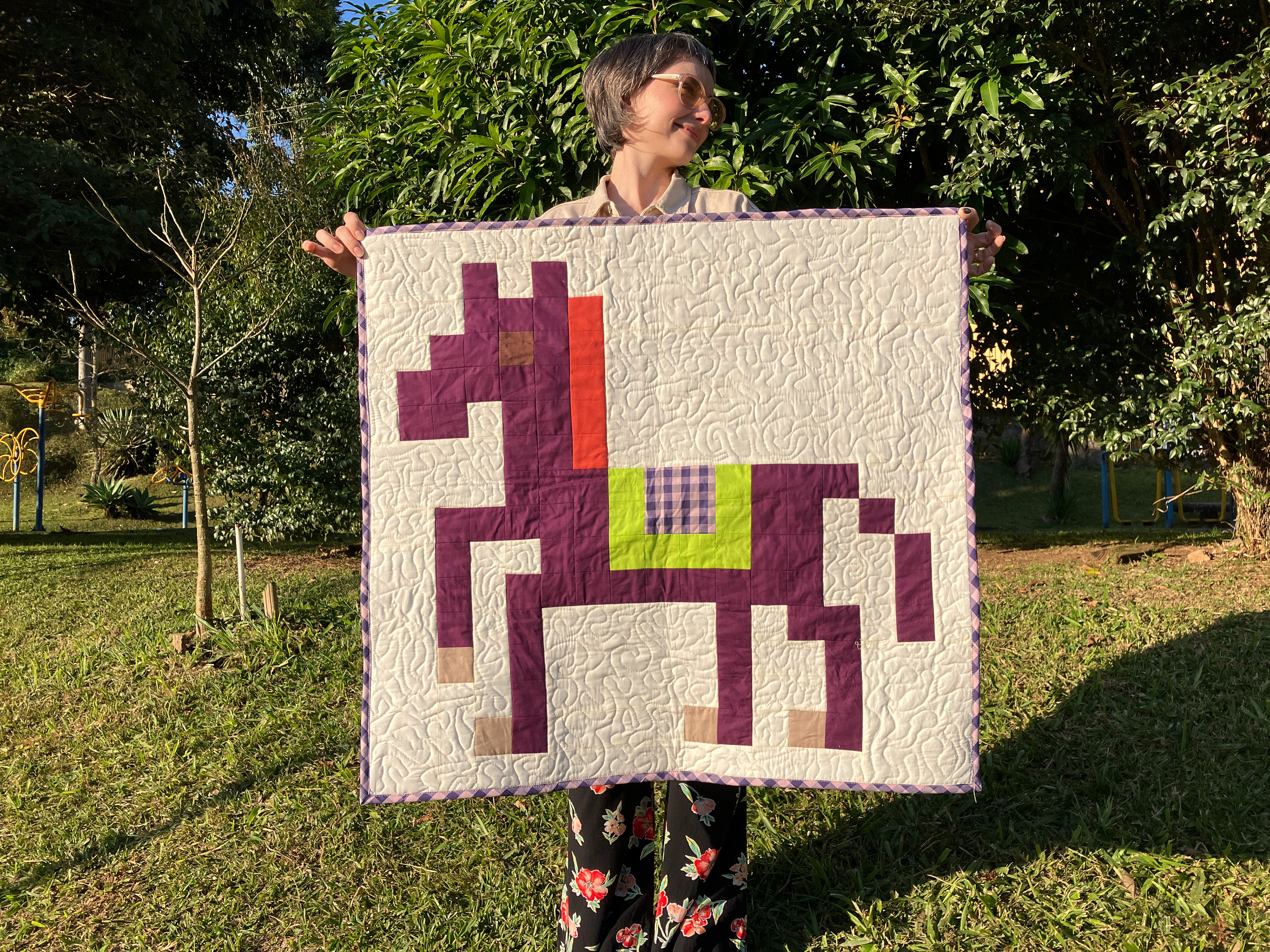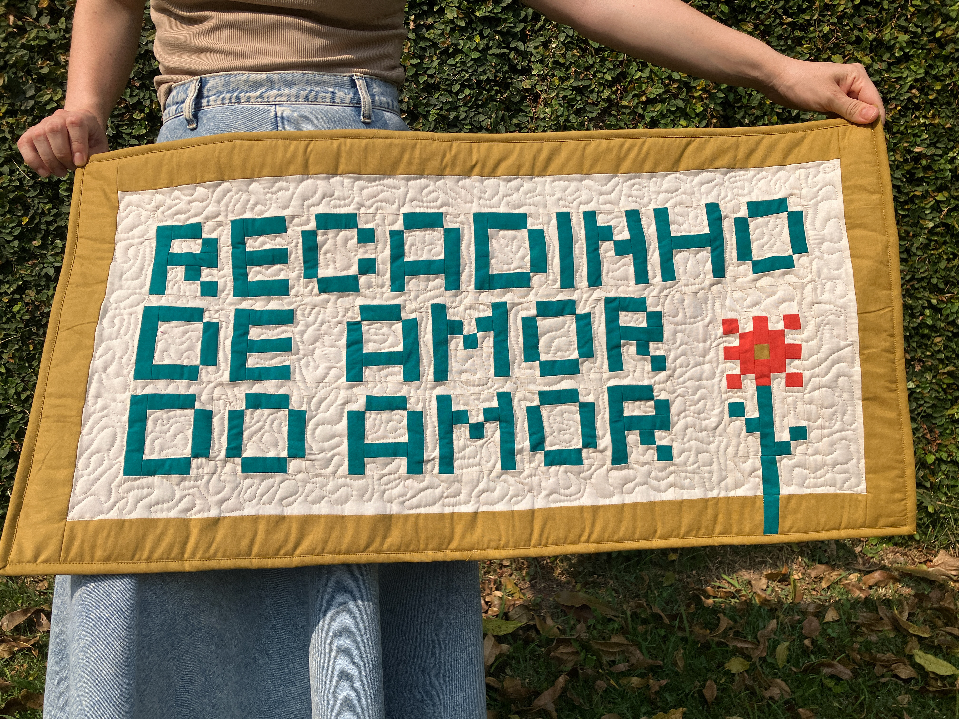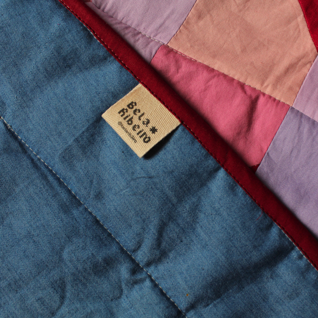 Trabalhos em quilt e patchwork exploram composição, repetição, memória e tempo, unindo técnicas tradicionais a investigações contemporâneas sobre superfície, cor e materialidade.
