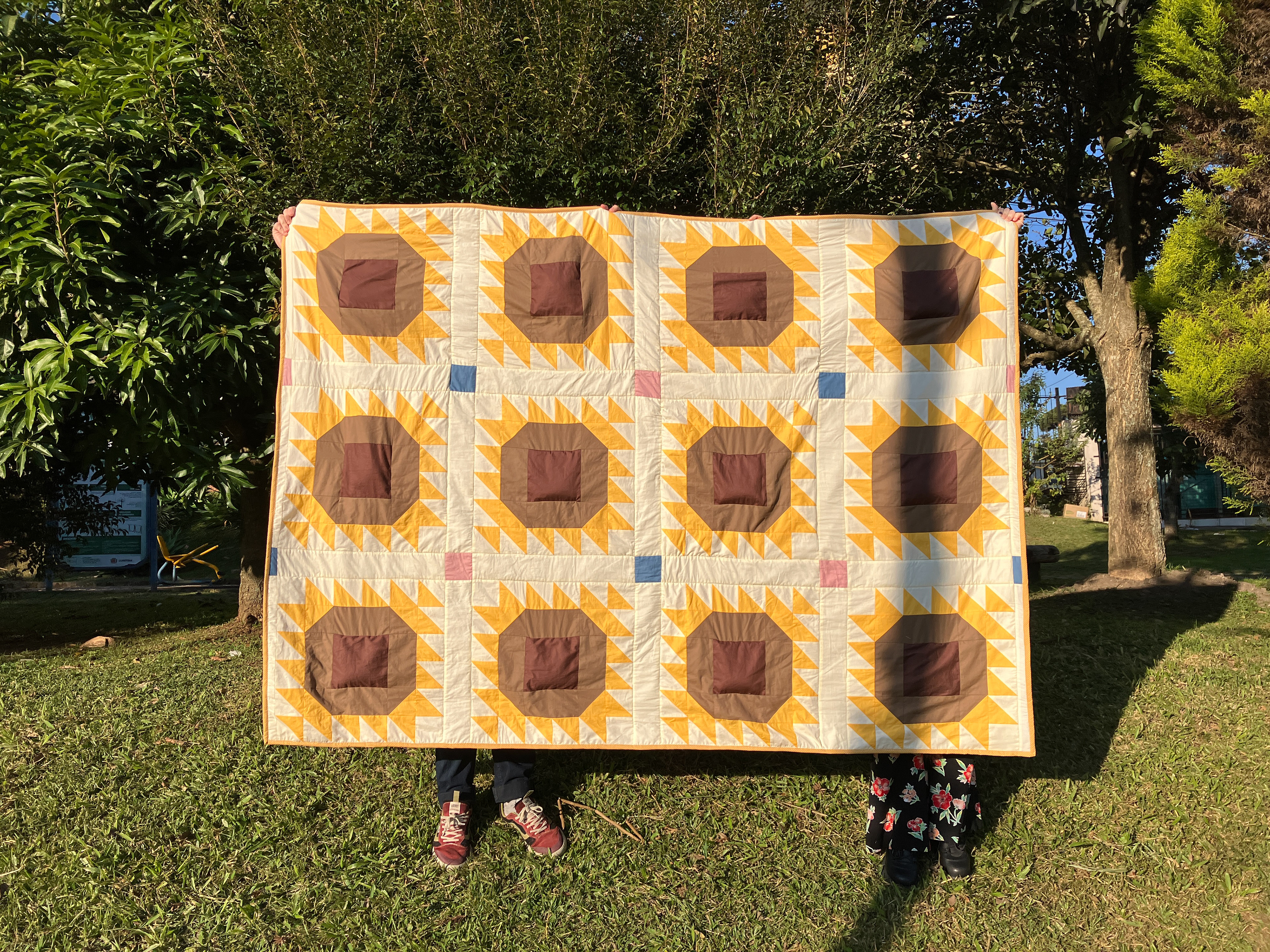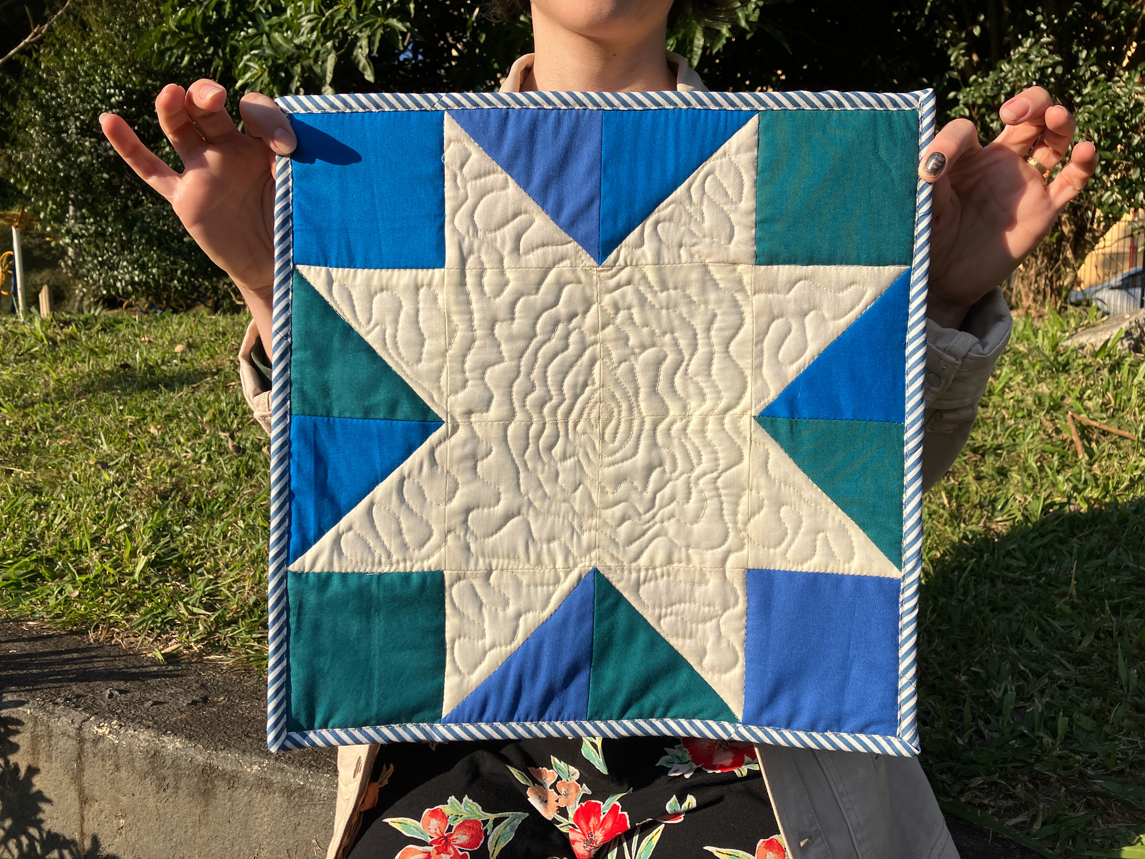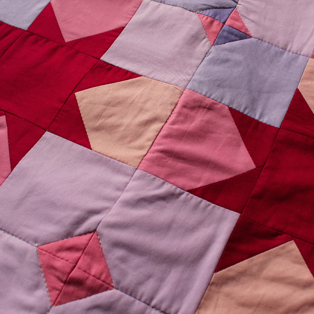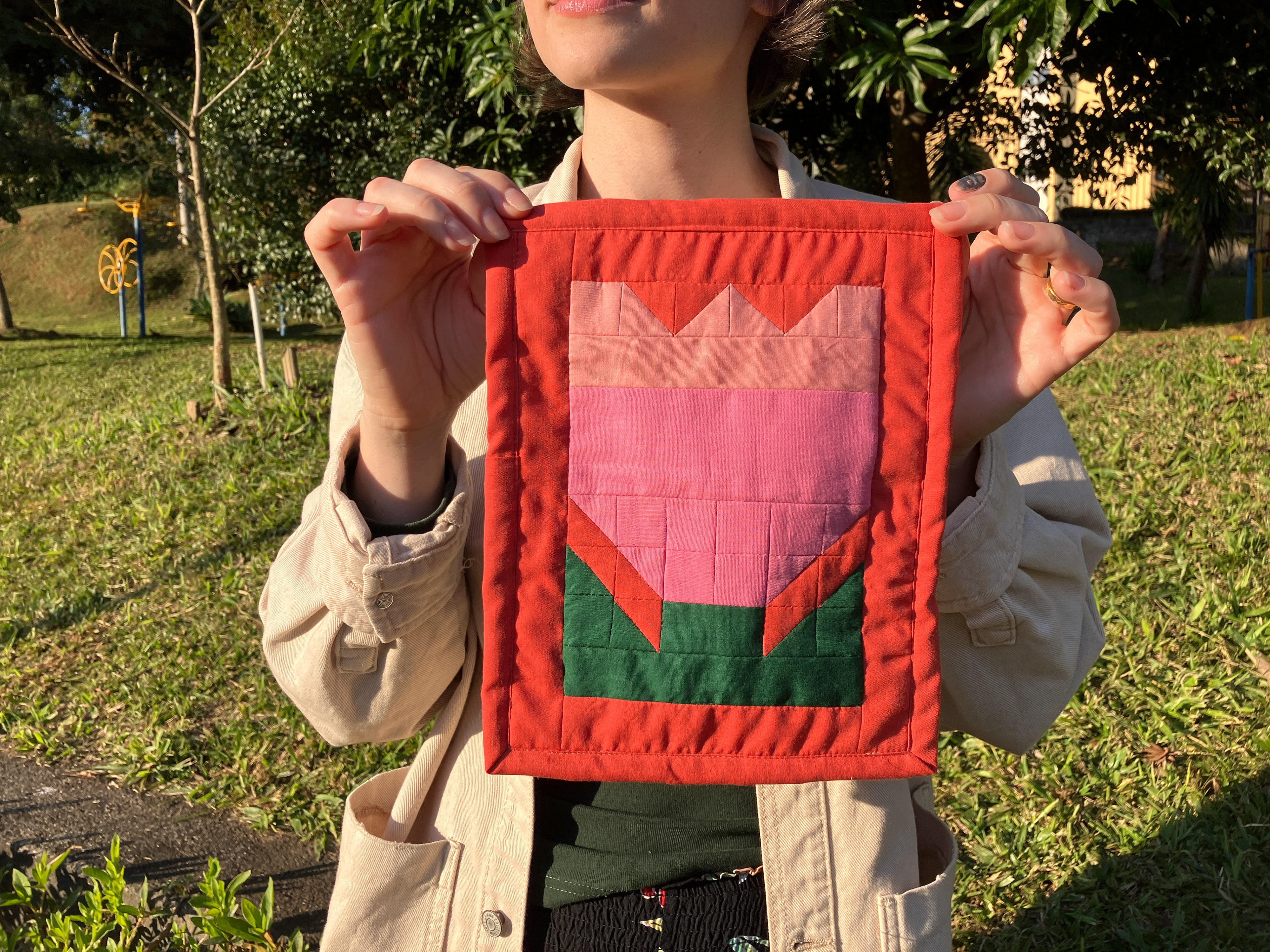 Trabalhos em quilt e patchwork exploram composição, repetição, memória e tempo, unindo técnicas tradicionais a investigações contemporâneas sobre superfície, cor e materialidade.
